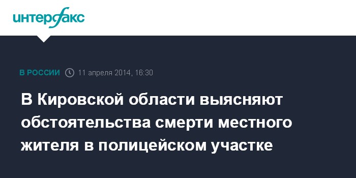 Москва. 11 апреля. INTERFAX.RU - Управление МВД РФ по Кировской области проводит служебную проверку по факту публикации в СМИ информации о смерти жителя поселка Подосиновец, который якобы был избит в районном отделе полиции, сообщил глава регионального УМВД Сергей Солодовников на пресс-конференции в пятницу.