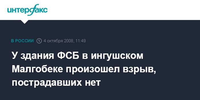 Москва. 4 октября. INTERFAX.RU - Взрывное устройство сработало под легковой автомашиной на стоянке возле здания ФСБ в Малгобеке, пострадавших нет.