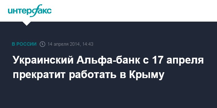 "С 17 апреля 2014 года Альфа-банк (Украина) прекращает банковскую деятельность на территории Республики Крым. Данное решение принято руководством в связи со вступлением в силу ряда законов Российской Федерации о функционировании финансовой системы на территории Крыма, что противоречит действующему законодательству Украины", - говорится в пресс-релизе Альфа-банка (Украина).