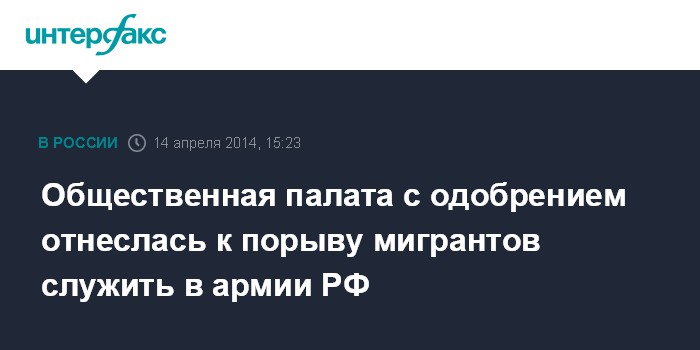 Москва. 14 апреля. INTERFAX.RU - Российская армии не страдает в недостатках кадров, но порыв мигрантов разрешить им службу в Вооруженных силах РФ заслуживает одобрения, считает глава комиссии Общественной палаты (ОП) РФ по проблемам национальной безопасности Александр Каньшин.