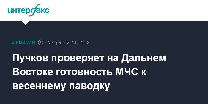 Хабаровск. 15 апреля. INTERFAX.RU - Глава МЧС России Владимир Пучков прибыл на Дальний Восток с целью оценить подготовку сил и средств МЧС и всей системы РСЧС к организации безаварийного пропуска паводковых вод в 2014 году, сообщает пресс-служба Дальневосточного регионального центра МЧС во вторник.