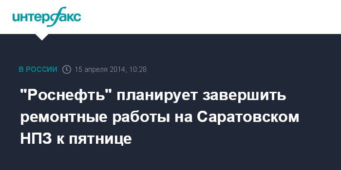 Москва. 15 апреля. INTERFAX.RU - Ремонтно-восстановительные работы на Саратовском НПЗ планируется завершить 18 апреля, сообщил Агентству нефтяной информации (АНИ) представитель "Роснефти".