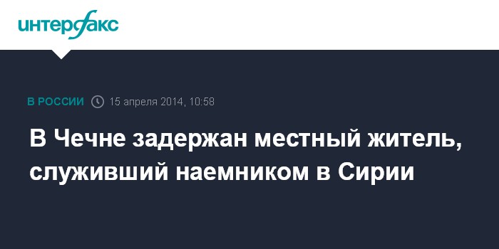 Он сообщил, что накануне в селе Гехи Урус-Мартанского района Чечни был задержан местный житель, подозреваемый в наемничестве. По данным силовиков, с весны и до окончания 2013 года мужчина воевал на стороне сирийской оппозиции. Ему грозит уголовное преследование по статье 359 УК РФ (наемничество) и лишение свободы на срок до семи лет.