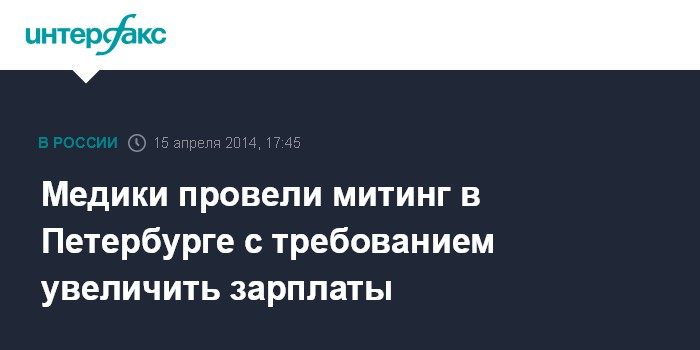 Москва. 15 апреля. INTERFAX.RU - В Санкт-Петербурге прошел митинг работников здравоохранения, требующих повышения окладов и стимулирующих выплат, сообщил председатель регионального отделения Профсоюза работников здравоохранения Владимир Дмитриев "Интерфаксу" во вторник.