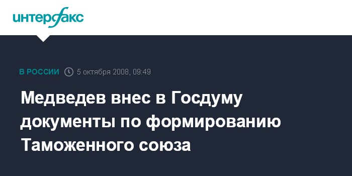 Москва. 5 октября. INTERFAX.RU - Президент РФ Дмитрий Медведедв внес на ратификацию в Госдуму документы, касающиеся формирования Таможенного союза.