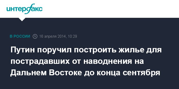 Москва. 16 апреля. INTERFAX.RU - Президент РФ Владимир Путин поручил до конца сентября завершить работы по ремонту поврежденных в результате прошлогоднего наводнения на Дальнем Востоке домов и строительству нового жилья для пострадавших.