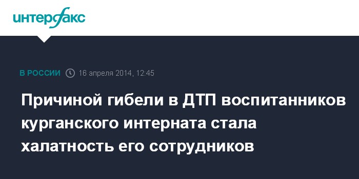 В результате прокурорской проверки по факту ДТП, в которое попали пять воспитанников Курганской школы-интерната, двое из которых погибли, установлено, что причиной трагедии стала халатность администрации школы-интерната, говорится в сообщении. Так, хотя в ночь на 27 марта дети самовольно покинули интернат, сторож и помощник воспитателя в полицию не обратились.