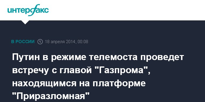 Москва. 18 апреля. INTERFAX.RU - Президент Российской Федерации Владимир Путин в пятницу в режиме телемоста проведет встречу с главой "Газпрома" Алексеем Миллером, находящимся на морской ледостойкой стационарной платформе "Приразломная", сообщает пресс-служба Кремля.
