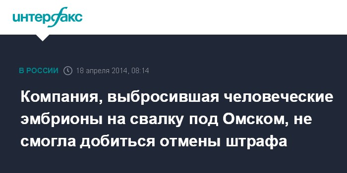 Москва. 18 апреля. INTERFAX.RU - Восьмой апелляционный арбитражный суд (Омск) признал законными штрафные санкции на 100 тыс. рублей, наложенные на ООО "Университет экологических проблем" за свалку человеческих эмбрионов на полигоне для отходов в Омске, сообщает в пятницу пресс-служба облпрокуратуры.