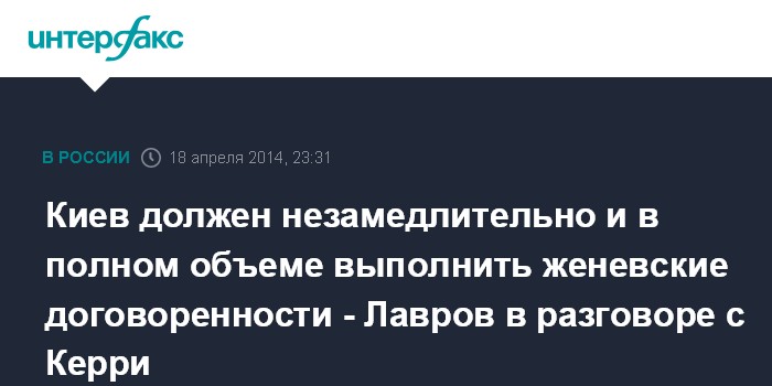 "С. Лавров обратил внимание на необходимость незамедлительного и полного выполнения нынешними украинскими властями положений Женевского заявления, которые предусматривают, в частности, отказ от насильственных действий и запуск общенационального диалога по новой конституции с участием всех основных политических сил и регионов", - сообщили в МИД РФ.