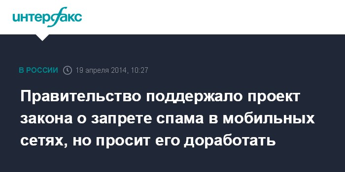 Москва. 19 апреля. INTERFAX.RU - Правительство России рассмотрело и поддержало внесенный группой парламентариев проект закона, направленного на защиту абонентов мобильной связи от нежелательных рассылок коротких текстовых сообщений, высказав к нему ряд замечаний.