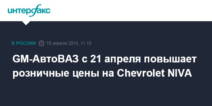 Москва. 19 апреля. INTERFAX.RU - "GM-АвтоВАЗ" с 21 апреля 2014 года повышает розничные цены на Chevrolet NIVA всех комплектаций на 10 тыс. рублей, сообщает пресс-служба компании. "Повышение цен на автомобили связано с удорожанием комплектующих изделий и внешними факторами", - говорится в сообщении.