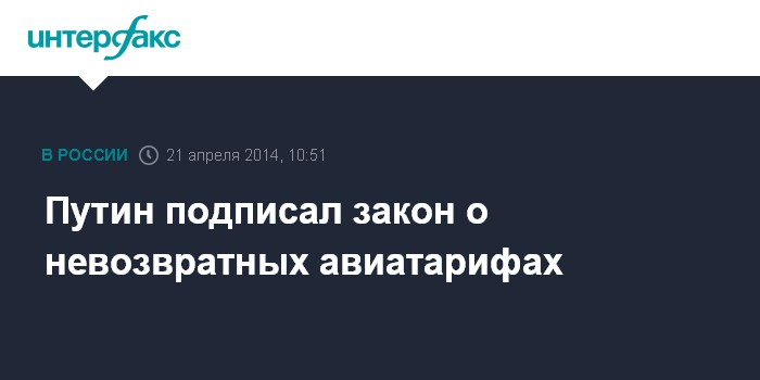 Москва. 21 апреля. INTERFAX.RU - Президент РФ Владимир Путин подписал федеральный закон, позволяющий российским авиакомпаниям применять невозвратные авиатарифы, сообщает пресс-служба Кремля.