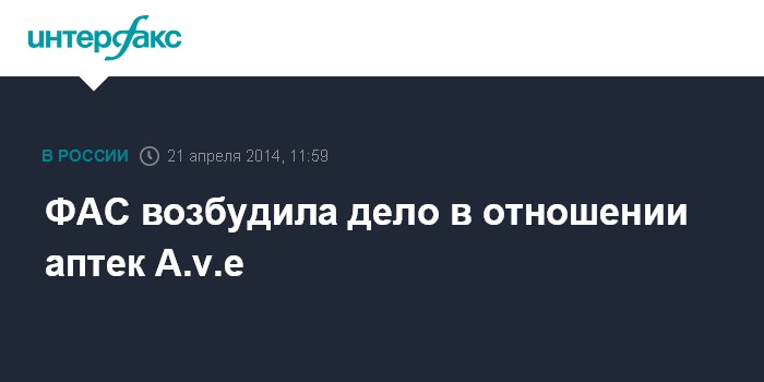 Москва. 21 апреля. INTERFAX.RU - Московское УФАС России возбудило дело в отношении ООО "Аптека - А.в.е." (A.v.e Group) по признакам нарушения рекламного законодательства, говорится в сообщении ведомства.