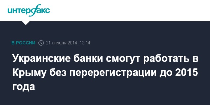 Москва. 21 апреля. INTERFAX.RU - Украинские банки смогут продолжить работу в Крыму до 1 января 2015 года без перерегистрации при условии соблюдения обязательств перед своими клиентами, заявил заместитель председателя Банка России Михаил Сухов.