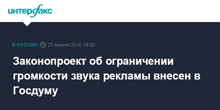 Москва. 21 апреля. INTERFAX.RU - В Госдуму внесен законопроект, подготовленный Федеральной антимонопольной службой (ФАС), который уравнивает громкость звука рекламы с громкостью теле- и радиопрограмм.