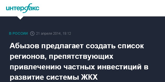 "Я хотел бы, чтобы у нас появился перечень регионов, которые препятствуют привлечению инвестиций в сферу ЖКХ. Инвесторы уходят, и на этом наживаются конкретные чиновники. Этому надо положить конец. В первую очередь, составить такой список", - заявил М.Абызов на заседании рабочей группы экспертного совета при правительстве РФ по развитию ЖКХ.