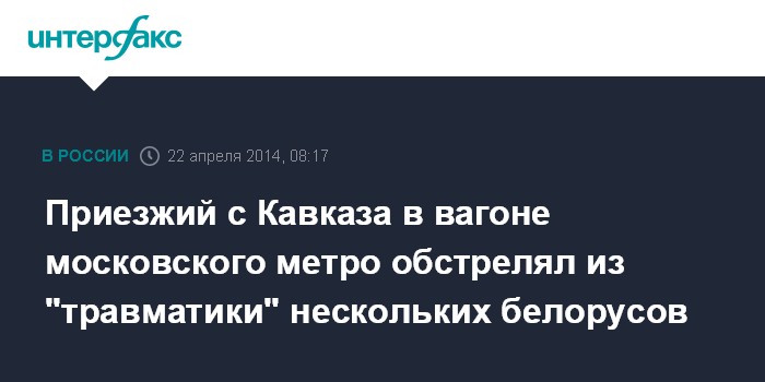 Москва. 22 апреля. INTERFAX.RU - Уроженец Северного Кавказа открыл стрельбу из травматического пистолета в столичном метро в потасовке с четырьмя гражданами Белоруссии, сообщили во вторник "Интерфаксу" в пресс-службе ГУ МВД России по Москве.
