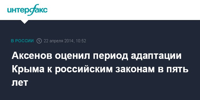 Москва. 22 апреля. INTERFAX.RU - Полная адаптация Крыма к российскому законодательству займет пять лет, переходный период может затянуться, заявил и.о. главы Республики Крым Сергей Аксенов.