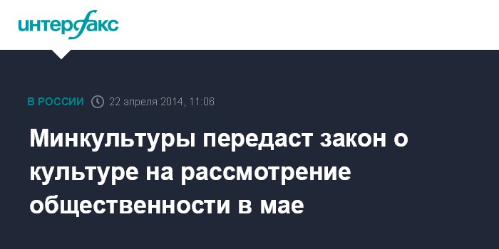 Москва. 22 апреля. INTERFAX.RU - Закон о культуре будет в мае передан на рассмотрение общественности, заявил министр культуры РФ Владимир Мединский.