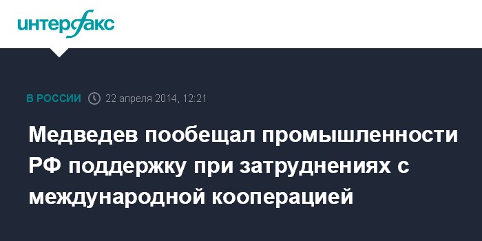 Москва. 22 апреля. INTERFAX.RU - Правительство РФ поддержит отрасли отечественной промышленности в условиях ограничения кооперации с иностранными партнерами, заявил премьер-министр РФ Дмитрий Медведев.
