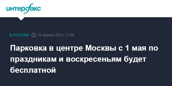 Москва. 22 апреля. INTERFAX.RU - Пилотный проект, в рамках которого размещение транспортных средств на платных городских парковках будет бесплатным по воскресеньям, нерабочим праздничным дням, а также 3 мая, 10 мая, 14 июня и 1 ноября, стартует в Москве 1 мая.