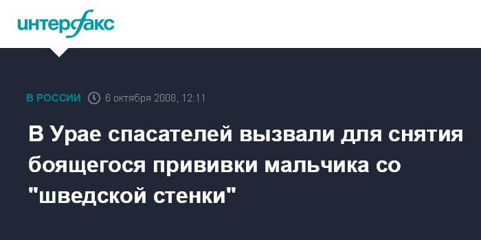 Москва. 6 октября. INTERFAX.RU - Спасатели Урая (Ханты-Мансийский автономный округ, ХМАО) были вызваны для того, чтобы оказать помощь в снятии мальчика, боящегося прививок, со "шведской лестницы".