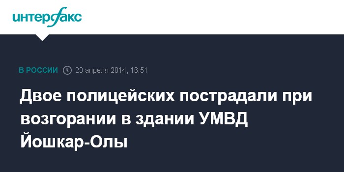 Москва. 23 апреля. INTERFAX.RU - Двое сотрудников полиции пострадали в результате возгорания в здании Управления МВД России по Йошкар-Оле (Марий Эл) в среду, сообщает пресс-служба республиканского МВД.