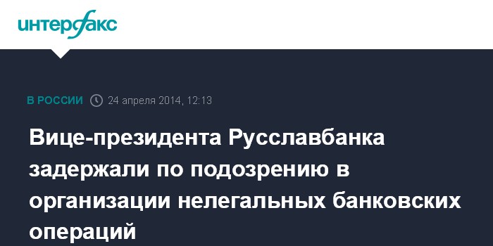 "В ходе проведения комплекса оперативно-розыскных мероприятий установлено, что в начале 2012 года вице-президент ЗАО "Русславбанк", использовавшегося в противоправной деятельности, создал организованную группу в целях осуществления комплекса нелегальных банковских операций, направленных на вывод из-под официального правового налогового и финансового контроля крупных денежных сумм", - рассказал сотрудник пресс-службы. По данным источника "Интерфакса" в правоохранительных органах, речь идет об Александре Миронове.