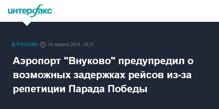 Москва. 24 апреля. INTERFAX.RU - Аэропорт "Внуково" предупредил пассажиров о возможных задержках рейсов в связи с репетициями парада на Красной площади.