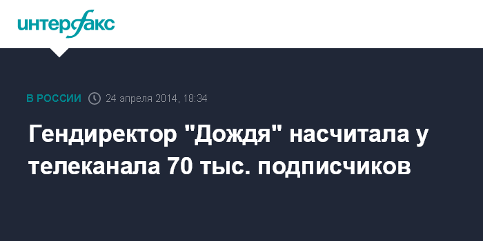 Москва. 24 апреля. INTERFAX.RU - Количество подписчиков телеканала "Дождь" на данный момент составляет 70 тысяч, сообщила генеральный директор канала Наталья Синдеева, выступая на конференции РИФ+КИБ-2014.