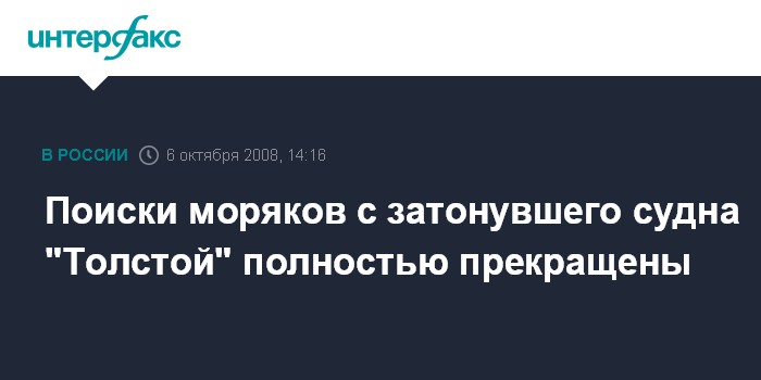 Москва. 6 октября. INTERFAX.RU - Поиски членов экипажа судна "Толстой" были полностью прекращены в субботу, 4 октября. Об этом в понедельник сообщили в пресс-службе Министерства транспорта и связи Украины со ссылкой на морской координационно-спасательный центр в Варне.