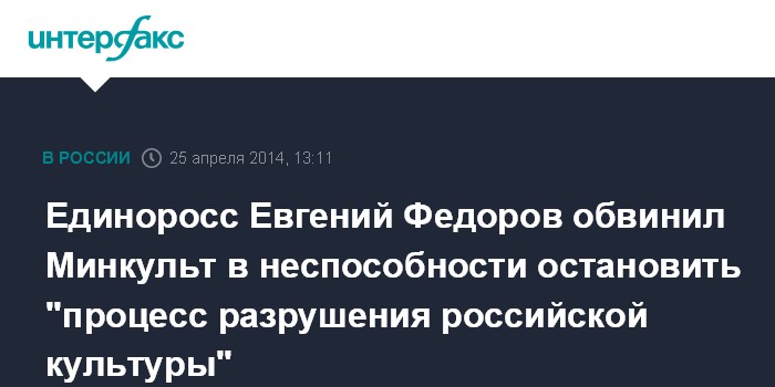 Москва. 25 апреля. INTERFAX.RU - Депутат-единоросс Евгений Федоров заявил, что Министерству культуры пока не удалось остановить политически и финансово поддерживаемый Западом процесс разрушения российской культуры.