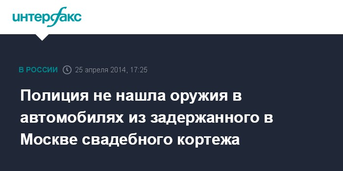 Москва. 25 апреля. INTERFAX.RU - Столичные полицейские не нашли оружия при досмотре транспортных средств из свадебного кортежа, задержанного после сообщений о стрельбе, сообщили в пятницу "Интерфаксу" в пресс-службе ГУ МВД России по Москве.
