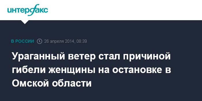 Москва. 26 апреля. INTERFAX.RU - Женщина погибла в районе села Троицкое под Омском после того, как на нее упал жестяной лист, сорванный ураганным ветром с павильона автобусной остановки, сообщила агентству "Интерфакс-Сибирь" старший помощник руководителя СУ СКР по региону Лариса Болдинова.