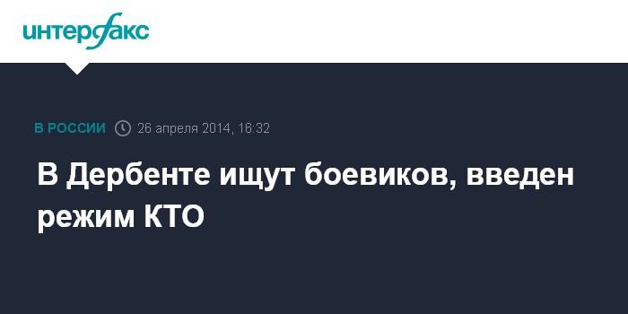 Москва. 26 апреля. INTERFAX.RU - Правовой режим контртеррористической операции (КТО) введен в субботу в 16:00 в Дербенте, сообщили "Интерфаксу-Юг" в оперативном штабе в Дагестане. "Проводятся мероприятия по поиску и нейтрализации участников НВФ и их сообщников", - сказал представитель оперативного штаба.