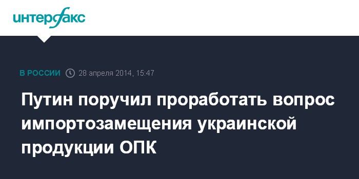 Москва. 28 апреля. INTERFAX.RU - Президент России Владимир Путин дал поручение правительству проработать вопрос по импортозамещению продукции Оборонно-промышленного комплекса, поступающей с Украины.
