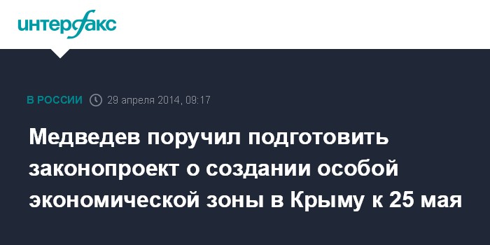 Москва. 29 апреля. INTERFAX.RU - Премьер-министр РФ Дмитрий Медведев поручил разработать и внести в правительстве проект закона о создании особой экономической зоны в Крыму и Севастополе к 25 мая этого года, сообщается на сайте правительства России.