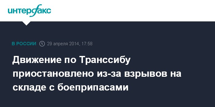 Москва. 29 апреля. INTERFAX.RU - В Забайкальском крае из-за взрывов на складе с боеприпасами приостановлено движение поездов по Транссибирской магистрали, сообщил "Интерфаксу" источник в местных органах власти. По его словам, возможны задержки пассажирских поездов.