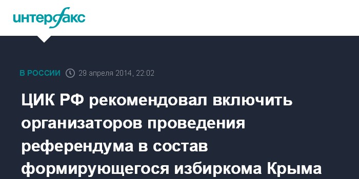 Москва. 29 апреля. INTERFAX.RU - ЦИК РФ предложил назначить председателя избирательной комиссии по проведению крымского референдума Михаила Малышева в формирующийся состав крымского избиркома.