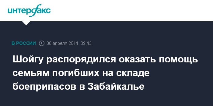 Москва. 30 апреля. INTERFAX.RU - Министр обороны РФ Сергей Шойгу дал указание оказать всю необходимую помощь семьям погибших и пострадавшим в результате пожара на складе инженерных боеприпасов в населенном пункте Большая Тура Забайкальского края.