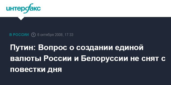 Москва. 6 октября. INTERFAX.RU - Москва не снимает с повестки дня вопрос о создании единой валюты России и Белоруссии и предлагает создать валютный пул, заявил председатель правительства РФ Владимир Путин.