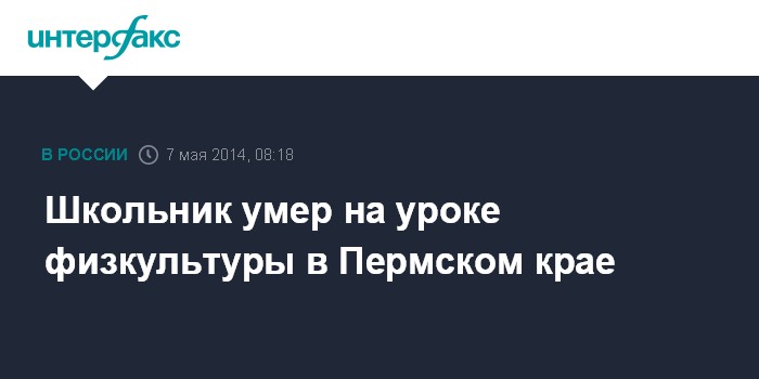 Москва. 7 мая. INTERFAX.RU - 14-летний школьник скончался во вторник в одной из школ Чайковского района Пермского края во время урока физкультуры, сообщает пресс-служба СУ СКР по Пермскому краю в среду.