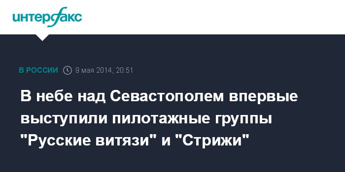 Москва. 9 мая. INTERFAX.RU - Летчики пилотажных групп "Русские витязи" и "Стрижи" впервые выступили в небе Севастополя в рамках празднования Дня Победы и 70-летия освобождения города-героя, сообщает корреспондент "Интерфакс-АВН" в пятницу.