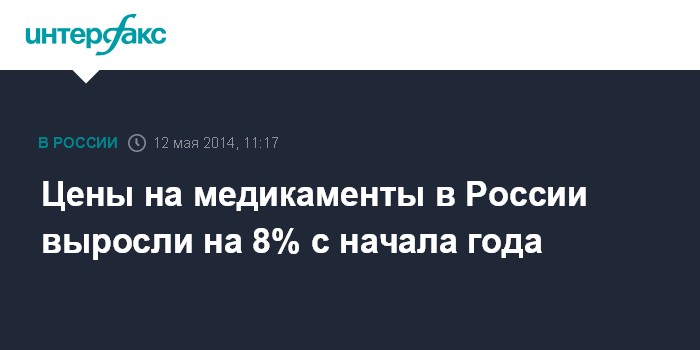 Москва. 12 мая. INTERFAX.RU - Цены на медикаменты в России в январе-апреле 2014 года выросли на 8% по сравнению с аналогичным периодом годом ранее, свидетельствуют данные Росстата.