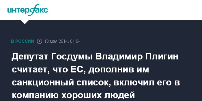 Москва. 13 мая. INTERFAX.RU - Глава комитета Госдумы по конституционному законодательству и госстроительству Владимир Плигин, пополнивший в понедельник санкционный список ЕС, считает, что Евросоюз включил его в хорошую компанию людей, отстаивающих национальные интересы России.