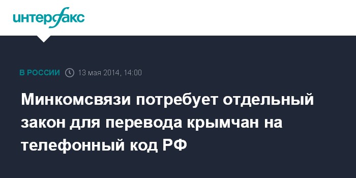 Москва. 13 мая. INTERFAX.RU - Перевод абонентов Крыма и Севастополя на российский телефонный код может потребовать принятия отдельного федерального закона, сказал журналистам глава Минкомсвязи РФ Николай Никифоров. "Я думаю, придется отдельным законом это отрегулировать", - отметил он.