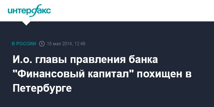 Москва. 15 мая. INTERFAX.RU - Исполняющего обязанности председателя правления банка "Финансовый капитал" Никиту Даньшина похитили в Петербурге, сообщили в СУ СКР по Санкт-Петербургу.