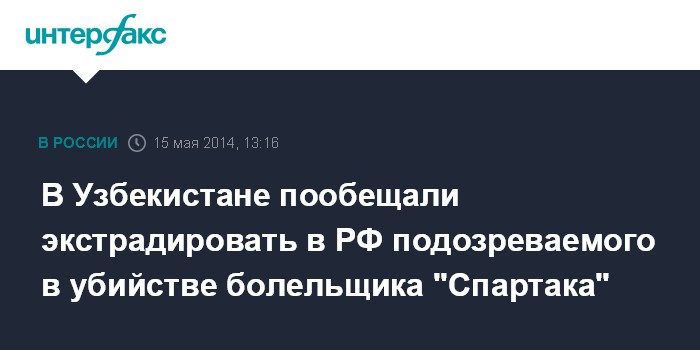 Москва. 15 мая. INTERFAX.RU - Российские правоохранители договорились с коллегами из Узбекистана о задержании и экстрадиции Жахонгира Ахмедова, подозреваемого в непредумышленном убийстве болельщика "Спартака" в Подмосковье, сообщил источник, знакомый с ситуацией.
