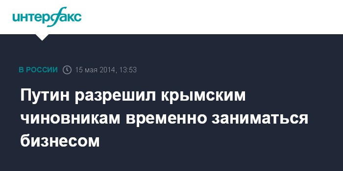 Москва. 15 мая. INTERFAX.RU - Президент РФ Владимир Путин подписал указ, согласно которому крымские чиновники или граждане, собирающиеся работать в органах власти республики, смогут заниматься предпринимательской деятельностью.